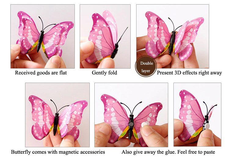 • Instructions d’installation détaillées : Pliez les ailes à 35° pour créer l’effet 3D, retirez la protection des adhésifs, et positionnez le papillon sur le mur. Appuyez doucement pour le fixer.