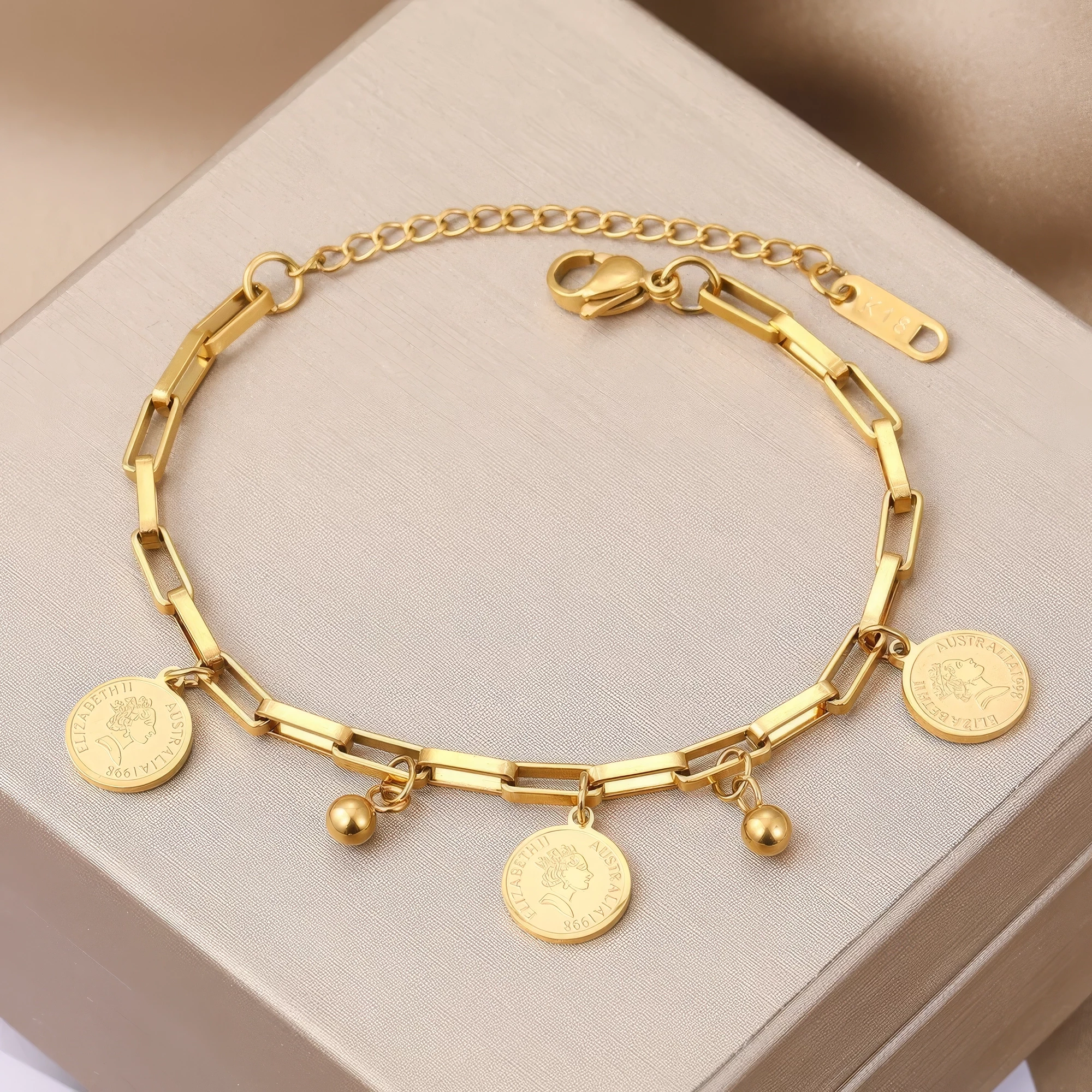 • Design : Chaîne élégante avec breloques en forme de pièces de monnaie